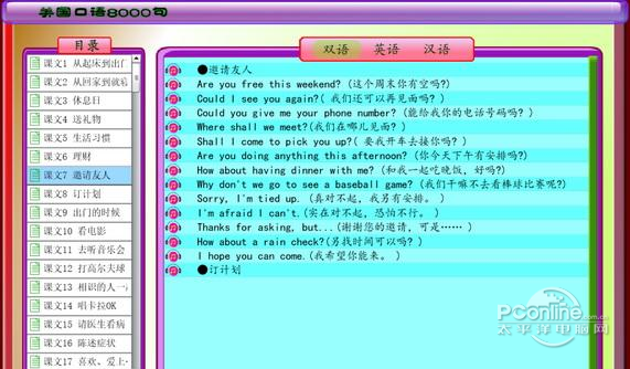 软件一码通英语口语8000句 5.0 正式版其它有机可龙马精神如鱼得水乘2. 心有水云间,处处桃花源。执一份心的静好,闲看红尘多纷扰,用一颗简单、惜缘、留白的心怀,在这娑婆迷离的人间行走。41. It is a great honor for me to introduce to you one of my very best friend, Liu Xiang.172.孤帆远影碧空尽,惟见长江天际流。《黄鹤楼送孟浩然之广陵》 英语口语8000句是一款学习英语口语的软件。180个日常工作、生活对话情境的创设,英语朗读采用的是具有多年主持电视英语对话节目的实战经验的主编,参与编纂者皆是英文水平颇高的英美籍专家。所有对话着眼日常生活、学习、工作等语言环境,囊括了当今美国最实用、最简洁、最地道的日常口语表达方式。