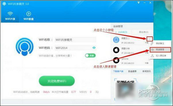 使用方法: 一、怎么使用wifi共享精灵限速? 1、点击右侧“倒三角”,就会看到限速管理,开始实施限速  wifi共享精灵下载软件截图5 2、点开以后,拖动倒三角形,开始限速,用鼠标拖动即可  软件截图6 二、怎么设置热点? 1、依次点击电脑的“开始—控制面板—网络和共享中心,可以看见下边这样的界面,点击“更改适配器设置  软件截图7 2、进行网络配置。我是用的是“本地网络”,或许有人使用的”宽带网络”,“无线网络”都是一样的设置。下图“无线网络连接4”就是WiFi共享精灵的无线网络,以我的本地网络为例,左键点击“本地网络”在右键点击,有弹出一个菜单栏,点击“属性”—“共享”,如下图,框框勾勾,下面的选择WiFi新增的无线网络,点击确定,此时本地网络会出现“共享的三个字。  软件截图8 3、启动WiFi共享精灵,点击“共享设置”选择下面红色框框的现象后点击启动,几秒后会启动成功。  软件截图9 常见问答: 一、如何创建免费WiFi热点? 安装WiFi共享精灵,开机自启动即可创建WiFi热点,手机打开WLAN连接。 二、手机怎样查看网速和流量节省问题? 手机连接WiFi热点在线实时统计(流量的上传和下载总和),得到已节省的流量;节省的流量乘以目前市场上3G流量费(目前市场3G流量为0.3元/M)。软件重启之后,节省流量归零重新计算。 这是一款比较好的无线热点,它可以帮助你实现多机一起上网,只要你电脑有网,装了它就能让手机一起上网啦!而且可以帮你传照片哦,从手机上直接用这款软件同步去电脑上,方便保存了。如果有人蹭网可以踢掉拉黑,防止恶意蹭网哦!喜欢的朋友可以将wifi共享精灵官方下载体验。 烛影摇红 廖世美独在异乡为异客,每逢佳节倍思亲。wifi精灵官方下载,wifi共享精灵官方下载,wifi共享精灵正式版60、No fire without smoke. |