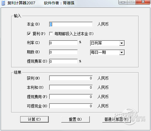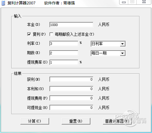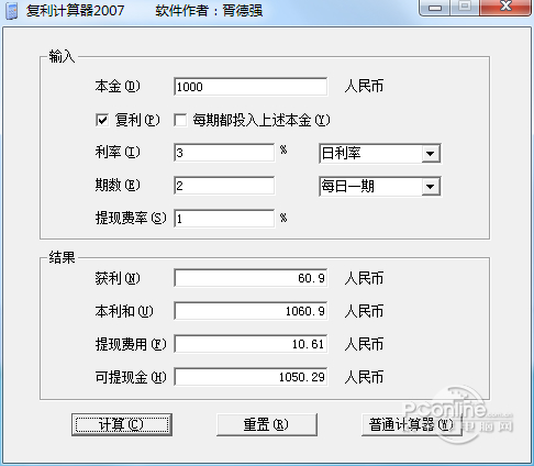复利计算器 1.0.0.1 正式版免费丽日临空谈笑风观众多(座无虚席)生21. 想起十六岁那年,站在女子中学的花园里所感到的眩晕。那年春天,波斯菊开得特别放浪,我站在花园中间,四望皆花,真怕自己会被那些美所击昏。80. I was deeply moved by the young boy, because I know Lei Feng is still living in our hearts.254.春江潮水连海平,海上明月共潮生。张若虚《春江花月夜》 复利计算器(理财复利计算器)是理财达人必备的工具,可根据本金、利率、期数、提现费率来快速计算出获利和本利和及可提现金数。本站免费提供复利计算器下载。  理财复利计算器软件截图1 软件特色: 复利是什么?复利就是指你的本金+利息也能得到利息。正常的利息只是表示你的本金能得到利息。比如同样是投资10万,你能找到一份年回报30%的投资,不按复利计算30年后将变成100万。如果你能找到一份年回报30%的投资,按复利计算30年后将变成26200万。 安装步骤: 复利计算器软件无需安装 使用方法: 一、如何使用复利计算器软件? 1、打开计算器 2、输入数据  银行复利计算器下载软件截图2 3、点击计算  软件截图3 常见问答: 一、求银行贷款复利计算公式? 银行贷款的复利计算公式为:F=P*(1+i)N(次方),其中F为复利终值、P为本金、i为利率、N为利率获取时间的整数倍。
