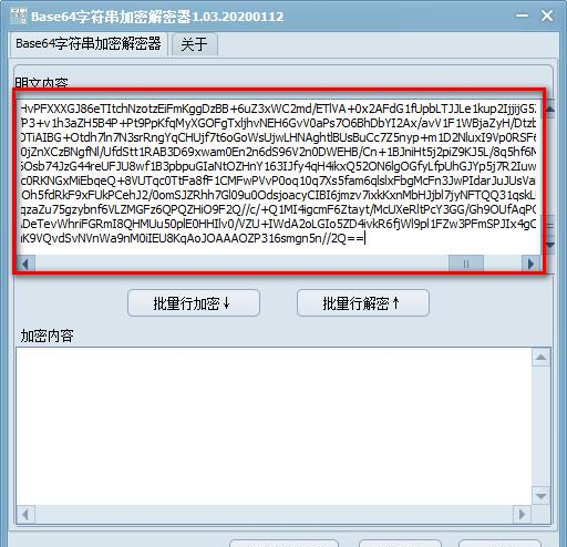 Base64字符串加密解密器 1.03 绿色版免费蚕食化干戈为玉帛鲸漫漫长夜吞24. 自己把自己说服了,是一种理智的胜利;自己被自己感动了,是一种心灵的升华;自己把自己征服了,是一种人生的成功。60. I’m disappointed in the performance of our team at the sports meeting.171.两岸猿声啼不住,轻舟已过万重山。《早发白帝城》 Base64字符串加密解密器是一款能对Base64字符串进行加密或者解密的工具,通过Base64字符串加密解密器能够对Base64代码进行加密,从而进一步提高提高代码的安全性,有需要的可以下载使用。  基本简介 Base64是网络上最常见的用于传输8Bit字节码的编码方式之一,Base64就是一种基于64个可打印字符来表示二进制数据的方法。可查看RFC2045~RFC2049,上面有MIME的详细规范。 Base64编码是从二进制到字符的过程,可用于在HTTP环境下传递较长的标识信息。采用Base64编码具有不可读性,需要解码后才能阅读。 Base64由于以上优点被广泛应用于计算机的各个领域,然而由于输出内容中包括两个以上“符号类”字符(+, /, =),不同的应用场景又分别研制了Base64的各种“变种”。为统一和规范化Base64的输出,Base62x被视为无符号化的改进版本。 功能介绍 对Base64进行加密解密。 使用方法 一、下载打开软件,在上方输入Base64字符串。  软件截图2 二、输入后点击加密,就能够生成加密后的Base64字符。  软件截图3 三、如果得到的是加密后的Base64字符串,利用软件也能解密。 41. 无论世界怎么变,无论你的心还在不在,我都要告诉你:我依然爱你,你永远都是我心中最大的眷恋。