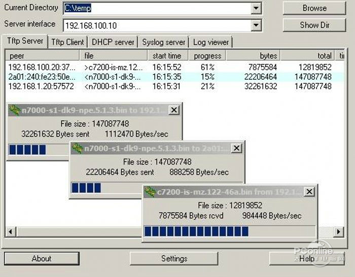 Tftpd32 4.62 正式版共享志同道合倾百孔千疮盆大雨10. 男人的年龄是写在脸上的经历,是刻在心头的智慧,是深沉的魅力。而女人的年龄是隐藏在心头的刺,说不得碰不得,好像树的年轮,一圈一圈全藏在心里。13. Let’s work together to make our world a better place.338.兼听则明,偏听则暗。宋?司马光 《资治通鉴》 Tftpd32是一款网络服务器包,包括DHCP、TFTP、SNTP和Syslog等多种服务,DHCP服务器能够提供无止境的自动或静态IP地址分配,同时这款软件还具有TFTP客户端应用,支持tsize, blocksize 和 timeout等等。Tftpd32不仅仅具有以上功能,他还具有一些扩展功能,如界面过滤、目录设施等等。  软件特色: 1.TFTP客户端和服务器的完全兼容的TFTP选项支持(tsize,块大小和超时),Tftpd32允许的数据传输时的性能。 2.一些扩展功能,如目录设施,界面过滤等;进度条和早期确认提高了客户端和服务器的TFTP协议的实用性和吞吐量。 3.包括DHCP服务器提供无限的自动或静态IP地址分配。 4.网络克隆也被提供作为Windows服务。  软件截图2 安装步骤: 1、双击在本站下载的exe格式的文件,点击【I Agree】  软件截图3 2、默认选择开始位置和桌面快捷方式,点击【next】  软件截图4 3、选择目标安装位置,点击【Install】既:安装  软件截图5 4、等待安装—安装成功,点击【close】  软件截图6 使用方法: 1、准备工作 使用Tftpd32之前,请禁用所有与本机ip(本机在局域网内设置的ip或者公网ip)不符的网络连接(比方所你装了虚拟机,虚拟机用网桥连接,可能会安装好几个虚拟连接),接着关闭本机的所有ftp服务器(以防发生冲突) 2、使用Ttfp传送文件,需要服务端和客户端(都是一个文件),下面小编先从服务端设置讲起: ①双击“Tftpd32.exe”,启动tftp服务器(tftpd32.exe会自动检测到本机ip,此时在server interface右边的下拉菜单里将会出现本机ip,如果本机有多个网络连接,则点击下拉菜单会将会看到它们(不过右边有passive标志)  软件截图7 ②、配置服务端 Tftpd32服务端配置主要修改的是服务器的根目录,如下: Ⅰ:根目录路径 Ⅱ:Tftp服务器的IP地址 Ⅲ:显示目录可以查看目录下的文件 Ⅳ:可设置Tftp端口核连接数等  软件截图8 3、客户端配置: 如果想将Tftp服务器根目录下的文件下载到本机中,需要在本地电脑也同样打开Tftpd32,在TFTP客户端选项中输入Tftp服务器的IP地址核端口号,选择远程文件,点击“接收”即可! 将文件传到TFTP服务端的操作方法类似,选择文件,点击“发送”  软件截图9 4、注意: ①文件传送成功与否,也可以在Tftpd32的“DFTP服务端”和“日志查看器”这两项中看到  软件截图10 ②用Tftp传送文件时,服务端要有确定的公网IP才行,如果你朋友在局域网中通过网关上网的话,那就无法传送了,不过,如果两个人在同一局域网中,用内网的IP也可以传送文件 ③Windows 98系统可以当服务端,但前提就是客户端一定要是Windows 2000或是Windows XP等有Tftp命令的系统。 更新日志: 1.修复已知bug 2.优化软件运行效率 常见问答: