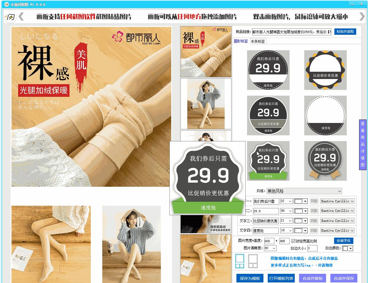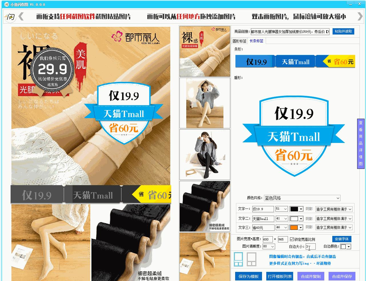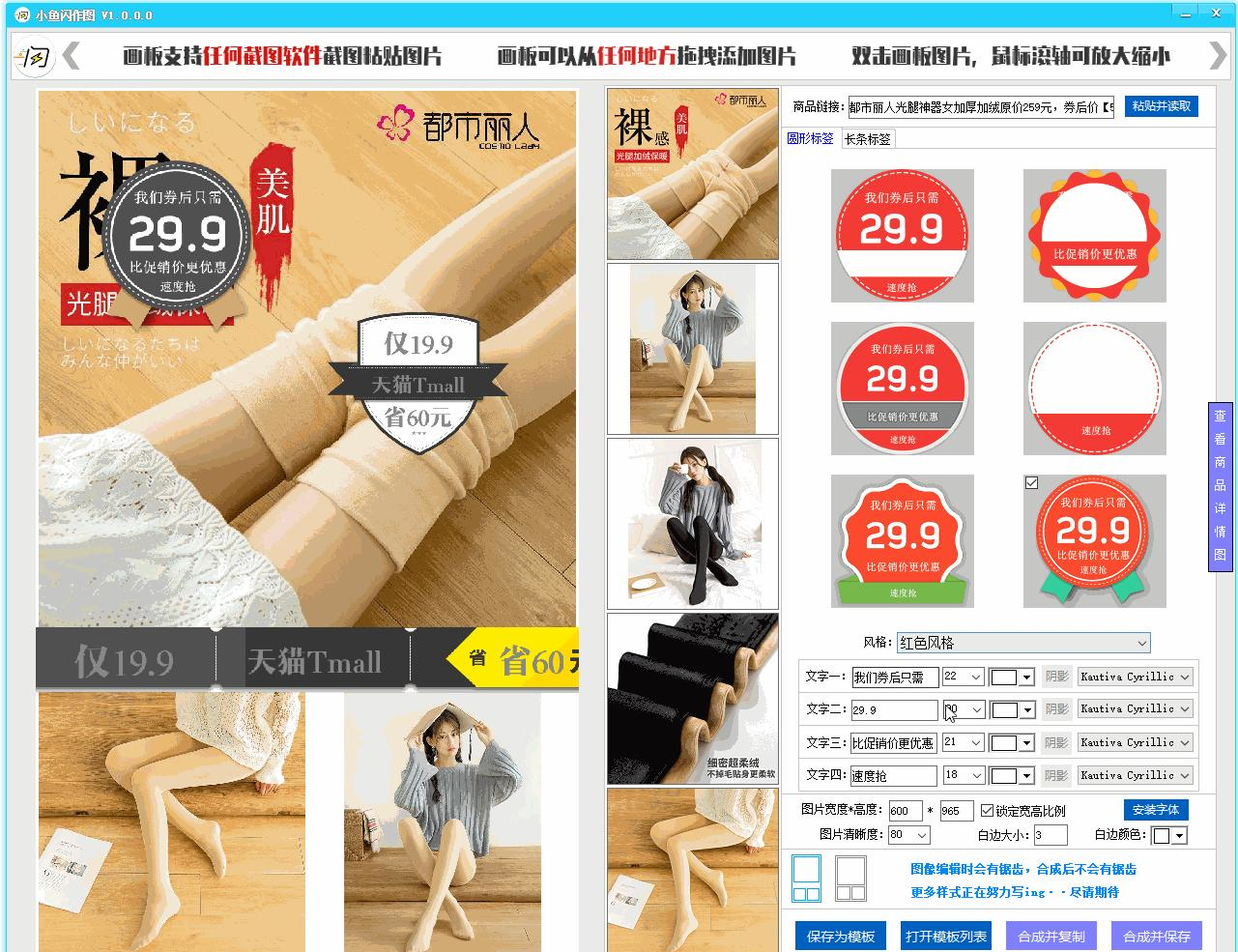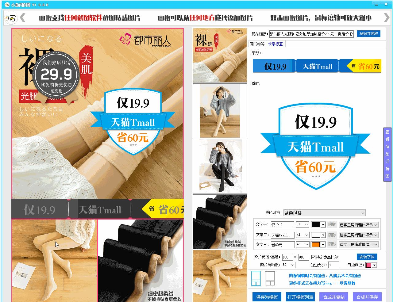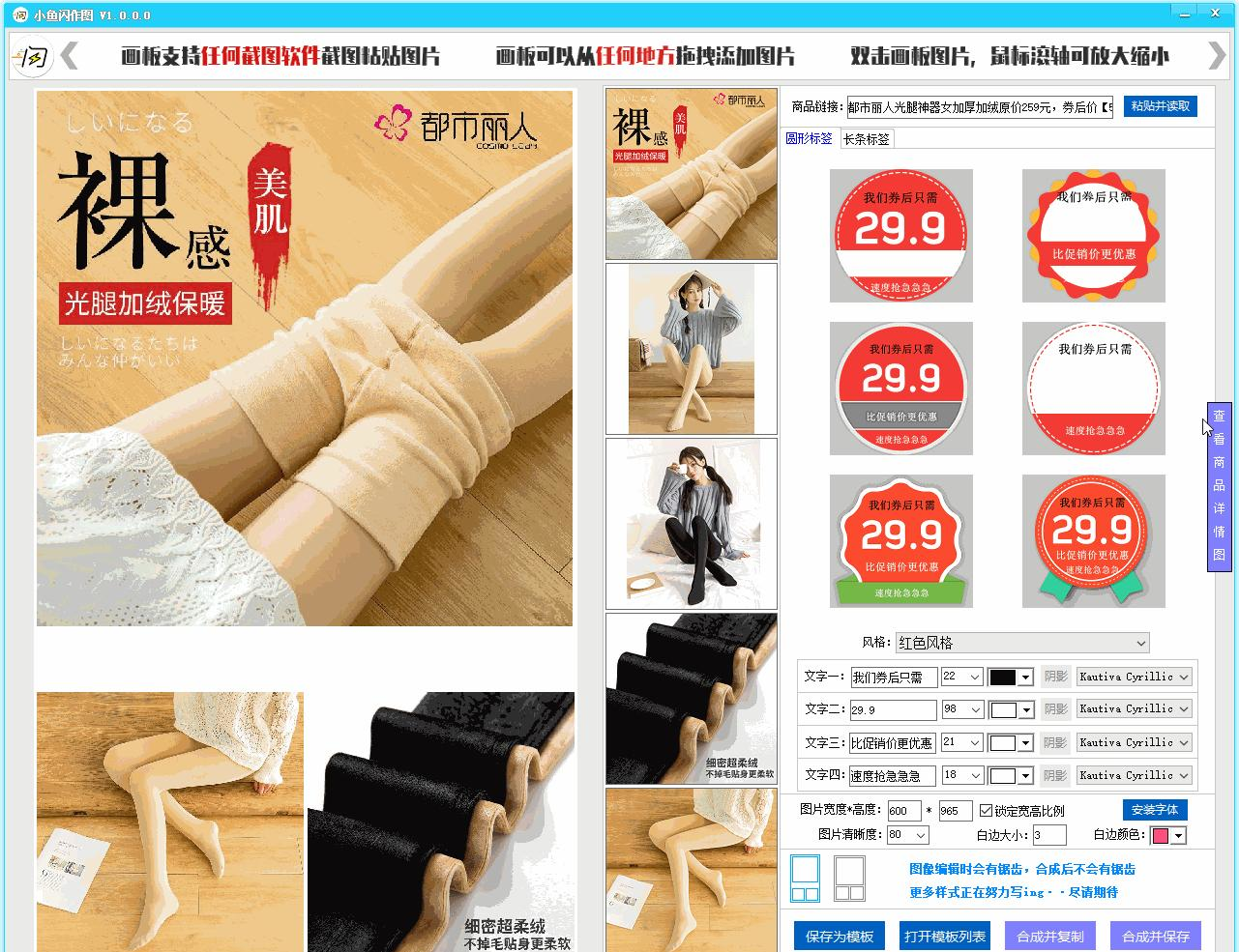 小鱼闪作图 1.0.0.0 正式版免费垂头丧气惊慌失湖光水色措31. 海浪不回避礁石的撞击,才得以壮观;人生不拒绝遗憾的存在,才得以明达。在线投票越来越盛行,很多比赛都让人们参与进来投票。柳永271.衣带渐宽终不悔,为伊消得人憔悴。《凤栖梧》/《蝶恋花》 小鱼闪作图是一款招商淘客作图神器,能够急速闪电作图,本软件仅不到3M大小,用了易语言自带的画板写的,完全的所见即所得,作图的时候,会有锯齿感,但合成后是没有的!  功能介绍 软件开启,会有软件的更新日志,右上角关闭即可。 右上角:可以粘贴商品链接,会自动识别商品id,取出该商品的5个主图,拖拽到画板即可~~  软件截图2 点击圆形标签,或者条形标签,可以将标签添加到作图区中,在作图区选中标签可以移动它~  软件截图3 在作图区选中标签,滚动鼠标滚轴,可以自由放大缩9. 当爱情不在的时候,请对他说声祝福,毕竟,曾经爱过。小标签~  软件截图4 可以自由选择标签的颜色风格~小提示:鼠标悬浮在选择框上面,滚动鼠标滚轴,可以快速选择~所有选择框都可以这样的哦~  软件截图5 想用哪个标签,就对着哪个标签,调相应的参数就好了 软件内置了两个漂亮的字体,不再采用系统内部字体,因为系统字体大部分不好看, 要安装自己的字体,请点击:安装字体 PS:win7系统不支持.otf字体。win10的话就没问题。  软件截图6 单击右边的:查看商品详情图,可以查看到该商品的所有详情图片,当5个主图不好看时,可以用详情图里的图片。 支持任何截图软件,截图后,粘贴到作图区。也可以从任何地方拖拽到作图区  软件截图7 可以调整外边框的大小和颜色,可以调整合成的图片质量,和图片宽高,尽量还是把:锁定宽高比 勾上,要不然合成的图片可能会变形  软件截图8 双击作图区的图片,可以进入编辑~鼠标左键按下,可以拖动它,鼠标滚轴可以缩小放大它~厉不厉害 点击黑色幕布,或者回车键,可以确认编辑~  软件截图9 点击作图区的标签后,键盘的上下左右键,可以移动标签,方便微调距离~  软件截图10 更新日志: 小鱼闪作图V1.0.0.0正式版[2019/1/19] 1.正式发布 2.优化内部图像合成逻辑,优化编辑图像逻辑 3.参数设置自动保存,重启软件后,参数设置依然是上次的设置 4.新增一种图片的样式,未来将增加更多图片样式 5.新增一种盾型标签 6.新增图片拖拽功能,可以从任何地方拖拽图片到图片合成区 7.新增设置图片白边颜色,大小的功能 8.新增设置合成图片的尺寸功能,让用户可以适应各个平台的规则 9.新增设置合成图片的清晰度,越清晰,图片文件会越大 10.新增快速选择文字的功能,不再选择系统字体,具体请看软件内置教程 11.新增查看商品详情图功能,可直接拖拽,也可以直接用任何截图工具截图,粘贴到作图区 12.新增图片合成区图片编辑的功能,添加到图片合成区的图片,双击后,可以进入编辑,鼠标滚轴可以放大缩小图片,左键按住图片可以移动图片位置 13.适应所有大小的显示器,显示器越大,作图区越大,作图更爽! 14.即将增加模板功能,合成的图片可以存为模板,下次可以直接拿来编辑就ok了 本功能实现有些复杂,等下个版本再上线吧~~ 修竹凝妆,垂杨驻马,凭阑浅画成图。山色谁题?楼前有雁斜书。东风紧送斜阳下,弄旧寒、晚酒醒馀。自消凝,能几花前,顿老相如?年年越溪女,相忆采芙蓉。小鱼闪作图,小鱼闪作图下载,图像处理,图形图像80、Give as good as one gets. |