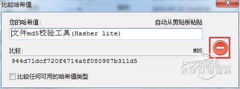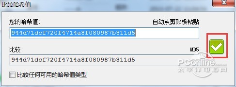 如果要对比文件MD5值的话,先把要对比的MD5值复制进剪贴板中,然后点击对比按钮,即可看到结果