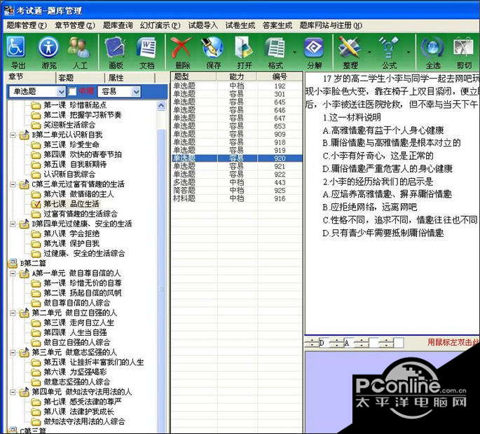 7.智能组卷策略:能按章节、能力、题型和套题要求组卷,有利于组合成单元卷和综合卷;能按题量多少分配各章节的试题数,按题库的能力分配试卷的分值;能自动随机选题,进行组合;能对生成的试卷进行难度调动、编辑和删除后再异步生成答案(这也是题库系统独具的最大亮点:好处就是不同时输出答案,待对整个试卷的试题做好调整后在进行答案输出,有利于重新编辑和再处理),能对生成的试卷提供按能力、章节和分值进行动态分析而提供多维细目表(这也是题库系统独具的最大亮点)。 8.建库方式灵活:手动拖放-在文档中将内容和答案用鼠标直接拖放到内容和答案编辑区当中保存;分解导入-就是由题库打开文档进行格式,在人工的干预下逐题添加;导入资源-通过备课组、教研组人员的分工、共建题库,最后用导入资源添加到题库当中,方便与他人交流题库,实现题库建设的资源共享。本题库提供强大的WORD试题导入功能,可以将现有WORD文档试题转化为题库格式,并添加到题库中,所以利用现有的资源可以很快捷地生成一套实用的题库!本题库是所有题库对导入试题要求最低,基本上对原试题无需做过多的人工干涉就能完全分割的唯一题库。 9.独具文档管理:支持题库试题直接转换到幻灯进行演示,并且可以在屏幕作图(有:曲线、直线、带箭头的直线、三角形、椭圆、矩形和圆角矩形)和文字标注(可设置文字的大小、颜色等),方便用户通过鼠标在屏幕上进行讲解和说明,具有电子教鞭、局部放大、屏幕绘图、图板说明等功能! 考试通题库-初中政治截图1 薄 幸 吕滨老斜拔玉钗灯影畔,剔开红焰救飞蛾。考试通题库-初中政治最新版,考试通题库-初中政治官方下载,考试通题库-初中政治2012新春版2.God helps those who help themselves. 天助自助者。 |