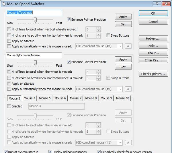 Mouse Speed Switcher(鼠标速度切换软件) 3.4.4 官方版免费艳阳鸟语蝉鸣七手八脚高照1. 在人生征途中有许多弯路小路险路暗路,只有意志坚定且永不停步的人,才有希望到达胜利的远方。造句:In 1951 Chairman Mao said in Nan Jing that the power of the mass is endless.322.城中桃李愁风雨,春在溪头荠菜花。《鹧鸪天?代人赋》 Mouse Speed Switcher是一款调整鼠标领灵敏度的软件,具备速度调整、两个鼠标切换,鼠标和触摸板鼠标切换,触摸板鼠标增强等几个功能,喜欢玩游戏的小伙伴们可以尝试下载  功能介绍 Mouse Speed Switcher是一款专业的鼠标灵敏度调整工具。笔记本外接鼠标的反映速度是有点慢的,在游戏的时候由为突出!虽然切换两种不同的鼠标的笔记本电脑是不同的速度和感光度设置您需要手动设置当您切换您的鼠标。Mouse Speed Switcher是您理想的笔记本电脑用户之间进行切换使用触摸屏和一个外接鼠标 ,但希望有一个不同的指针速度/灵敏度为每个设备。具备速度调整、两个鼠标切换,鼠标和触摸板鼠标切换,触摸板鼠标增强等几个功能! 使用方法 1、如果鼠标速度切换程序没有运行,请使用安装程序创建的快捷方式之一启动它,这些快捷方式位于桌面或Windows“开始”菜单中。启动MouseSS后,您可以配置其选项,右键单击系统托盘中的MouseSpeedSwitcher图标并选择“设置…” 2、用您选择的名称替换默认设备名称。 3、将“触摸板”和“外部鼠标”的滑块移动到所需速度,如果您有两个以上的设备,则可以启用和配置鼠标3、4和5。 4、如果需要,可以为每个鼠标选择鼠标滚轮配置并交换鼠标按钮。 5、如果您希望在计算机启动时使用特定的设置,请勾选“启动时应用”选项以选择一个(且仅一个)鼠标设置 6、如果您希望在使用特定鼠标时自动更改设置,请勾选“使用此鼠标时自动应用”选项,然后选择一个设备,因为通常很难理解哪个HID设备是正确的,只需使用您希望配置的设备并单击按钮“a”,MouseSS将自动设置您正在使用的鼠标 7、可以选择配置热键,以使用组合键更改设置。 如果你打算在全屏游戏中使用无鼠标热键,请尝试启用“使用原始输入而不是标准热键”选项,有时需要此选项,因为全屏游戏独占键盘和鼠标。 这是主配置窗口,您可以在这里找到5组选项,前2组始终启用,而设置3、4和5必须仅在需要时启用。此外,必须通过单击其按钮来选择设置3、4和5,这意味着如果要配置鼠标4,则需要单击标记为“鼠标4”的按钮 滑块和“提高指针精度”:这些设置控制鼠标指针速度,它们与windows控制面板相同。要读取当前的windows设置,请单击“获取”按钮,要检查当前设置,请单击“应用” N、 移动滚轮时要滚动的行数:勾选此选项可设置垂直滚轮的特定值,默认值为3。该值是要滚动鼠标滚轮一个凹口的行数。输入0可一次滚动一屏。 N、 移动水平滚轮时要滚动的字符数:勾选此选项可设置水平滚轮的特定值,默认值为3。该值是要滚动鼠标滚轮一个凹口的字符数。 交换按钮:勾选此选项时,左右按钮交换 启动时应用:选中此选项时,当无鼠标启动时自动应用此设置 使用此鼠标时自动应用:选中此选项时,移动指定的鼠标时自动应用此设置。您必须从右边的列表中选择设备。如果您不确定哪个设备是正确的,只需开始使用您想要设置的设备,然后单击按钮“A”,鼠标将自动选择您正在使用的设备。例如,如果要配置触摸板,请使用触摸板移动指针,然后单击“A”按钮。注意:要检测设备,您需要在单击“A”按钮之前移动鼠标指针,否则无鼠标可能无法正确检测设备。