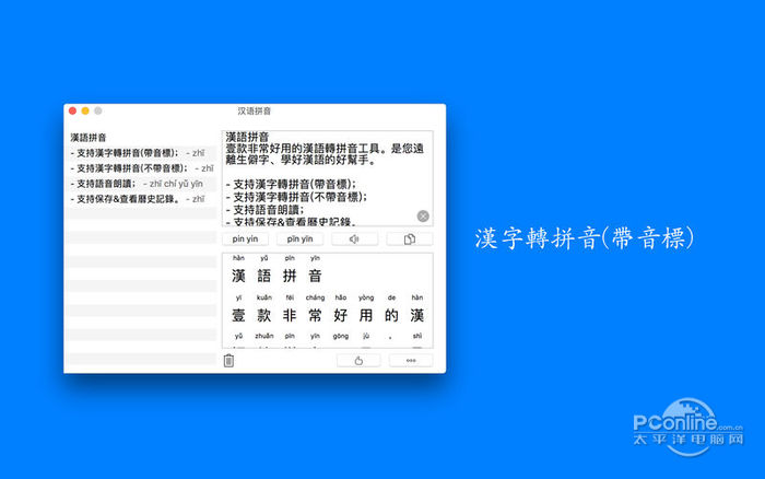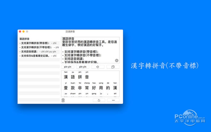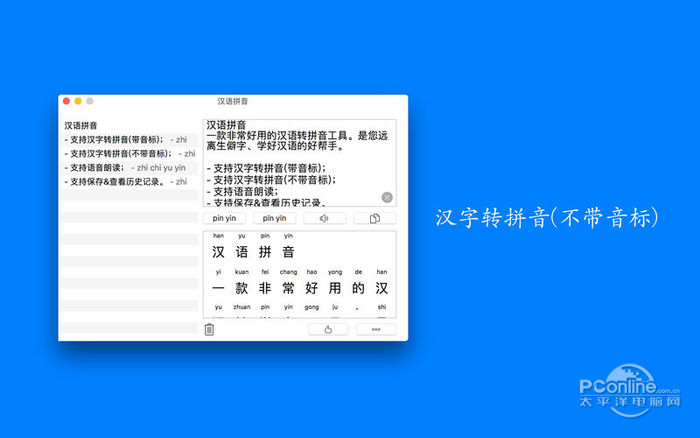 36. 时间如流转,爱情在酒影中烙印分离的宿命;光阴似流星飞逝,伤口在烟雾中凝结痛楚的疤痕。也许下站就是幸福。 汉语拼音是一款非常好用的汉语转拼音工具。是您远离生僻字、学好汉语的好帮手。 - 支持汉字转拼音(带音标); - 支持汉字转拼音(不带音标); - 支持语音朗读; - 支持保存&查看历史记录。  汉语拼音 Mac版 截图1 汉语拼音的新功能