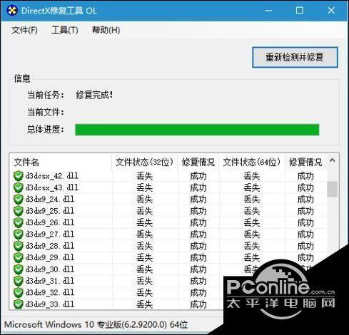 DirectX修复工具 4.0 正式版免费大雪封七嘴八乌云翻滚舌山32. 纵然是在自己心底一片狼藉的时候,我们还努力地持续着一片净土,持续着对周围那些纯净心灵的理解和赞赏,时刻提醒着自己:生命之中,还是有很多完美的东西值得我们去珍惜。43. Our class came up with the idea to make better use of used materials.(2016. 北京)黄庭坚294.桃李春风一杯酒,江湖夜雨十年灯。《寄黄几复》 DirectX修复工具是一款DirectX系统级工具软件。这款DirectX修复工具程序为绿色版,无需安装,简便易用,可直接运行,支持64位和win10系统。该工具主要针对0xc000007b问题设计,能够完美修复此问题。太平洋下载中心为您提供dx修复工具下载。 directx修复工具64位的主要功能是检测当前系统的DirectX状态,一旦发现有异常问题,就会进行修复。为了应对一般电脑用户的使用,dx修复工具3.8运用了傻瓜式设计,只要一键点击主界面上的“检测并修复”按钮,就会自动完成检测、修复以及注册的全部功能。本程序中全部DX文件都有Microsoft的数字签名,安全放心。选择DirectX修复工具下载,无需用户的介入,使用难度低,基本是小白用户都能轻易使用的检测和修复工具。  DirectX修复工具64位截图 功能特点: 1、一键完成检测修复,只要简单一键选择就能完成检测、修复、注册等一系列问题,使用门槛低,操作简单,真正的傻瓜设计。 2、适用多个操作系统,directx修复工具下载版不仅操作简单,还适用多个操作系统,微软的win8win7Windows Vista都适合使用。同时兼容32位和64位。更强大的是可以根据系统不同,自动调节设置。例如你是win10系统,DirectX修复工具win10可以自动调节适用于win10系统色任务模式。 3、异步多线程,采用异步多线程技术,实现检测、下载和修复等任务单独进行,并且互相不干扰。 4、窗口样式多样,有两种窗口样式,正常模式和简约模式,两种样式不同,适用于有不同需要的人群。一般来说默认的正常模式能满足大部分用户的需求。不过如果你想修复工作更加快速高效,可以选择简约窗口样式。 5、高级筛选功能,用户可以根据自己需求筛选选择需要修复的文件,提供效率。 6、自动记录日志,记录每次检测和修复的结果,方便用户及时查找原因,方便下次修复。 7、注重用户反馈,可以在用户同意下发送修复结果,同时用户也可以与软件作者沟通,共同查找问题,帮助用更加准确高效的完成修复。 8、含有多项高级功能。在“选项”一栏,具有5项高级功能。分别是:“注册系统文件夹中所有dll文件”、“扩展”、“DirectX版本”、DirectX加速”等。这些高级功能可以提供工作效率。例如,点击固定按钮,可以自动或者任意注册指定文件下里面的dll文件。 9、自动更新c++,DirectX修复工具在检测和修复问题时,还支持更新c++组件,提高修复软件的概率。 使用方法: DirectX修复工具win10是一款系统DirectX的修复工具,大家的游戏发生了DirectX错误就会无法启动。一起来看看DirectX修复工具怎么使用吧。 1、首先在下载本站提供的DirectX修复工具下载版,下载完成后解压。由于这个程序是绿色软件,因此不用安装,直接点击就可以使用。 2、DirectX修复工具的界面是非常轻便简洁的,它的整体使用也是非常的简单,只要系统提示了DirectX错误,我们打开软件点击“检测并修复”它就会自动帮修复你的电脑,基本不用你做其他操作,使用门槛不高。  DirectX修复工具64位软件截图2 3、软件自动检测修复完成后,单击“退出”,就完成了检测修复问题的主要流程。  DirectX修复工具64位软件截图3 4、在文件菜单还可查看它的日志文件,因此如果你想看修复的日志文件话,可以翻开DirectX修复工具查看,方便你分析和记录问题。  软件截图4 5、修复完成后,如果有需要,你可以点击“同时更新C++”。更新C++的目的主要在于检查问题是否出现在动态链上,更新后可以重启电脑,查看下效果。假如更新后有效果,即说明问题出现只更新链上。  软件截图5 6、另外需要注意的是,DirectX修复工具修复的问题更新完毕后,电脑需要重新启动才能生效。 更新日志: 新增支持DirectX 12文件、DirectX 12等相关文件检测及修复。 新增全新的c++扩展包。 新增c++强力修复功能。 修复的BUG: 修复异常BUG。 常见问答: 电脑通过DirectX修复工具检测并修复丢失dll文件的方法 1、在本站下载并安装 DirectX修复工具 ; 2、打开DirectX修复工具后,点击“检测并修复”按钮;  DirectX修复工具软件截图6 3、然后就会自动检测丢失的dll文件并进行修复,当提示“修复完成”即可。  DirectX修复工具软件截图7