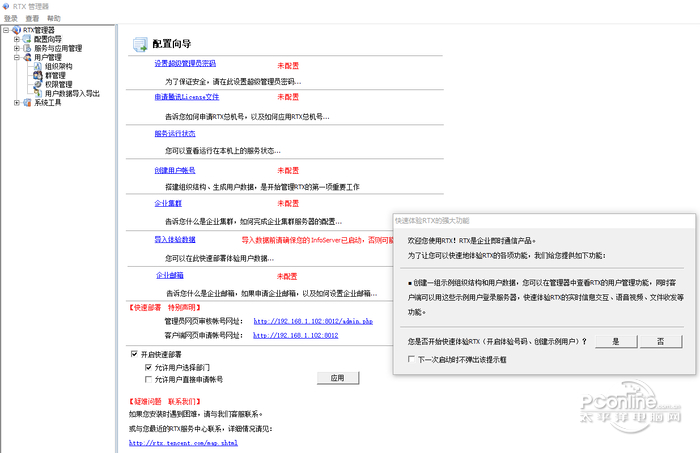 | 介绍 | RTX腾讯通 2011 正式版免费想得厉害(鸡犬不宁浮想波涛汹涌联翩)20. 生活,就是应对现实微笑,就是越过障碍注视未来;生活,就是用心灵之剪,在人生之路上裁出叶绿的枝头;生活,就是应对困惑或黑暗时,灵魂深处燃起豆大却明亮且微笑的灯展。欢迎任何感兴趣的同学来参加。16.仁者见仁,智者见智。 rtx腾讯通(Real Time eXchange)是腾讯公司推出的企业级即时通信平台。专为帮助企业提高效率,降低了沟通的成本,开拓商业发展,是一款可管理、低成本、已部署的平台。软件集成各种沟通方式,其中有文本回话、语音视频交流、手机短信等远程协作功能。本站免费提供rtx腾讯通下载。企业员工可以轻松地通过rtx腾讯通2011服务器所配置的组织架构查找需要进行通讯的人员,并采用丰富的沟通方式进行实时沟通。文本消息、文件传输、直接语音会话或者视频的形式满足不同办公环境下的沟通需求。RTX着力于帮助企业员工提高工作效率,减少企业内部通讯费用和出差频次。使团队和信息工作者进行更加高效的沟通。 ![]() RTX腾讯通截图1 功能介绍: 1、企业即时通信。企业内部即时通信功能,允许在线状态监测、即时发送/接收互联网/局域网消息,群发功能,个人资料查询功能,部门分组/自定义分组功能, 即时存储对话纪录,更改字体/样式/格式功能。 2、SMS手机短消息。企业QQ用户可以非常方便地即时发送手机短消息到全国各地的移动和联通手机上,同时各地的移动/联通手机也可以即时回复到企业QQ用户处。 3、分组讨论。可自行定义固定的问题讨论组,同时给出所有自定义讨论组的列表,方便发言及查看发言、查看日志等。 4、网络会议功能。基于文字、语音甚至视频的网络会议功能能够满足用户的多种需要,同时大大降低成本。另外单独交流功能使会议中的部分成员之间的文字/通话被保密。网络会议同样具有保留会议内容/纲要功能。 RTX 2011 正式版 新功能及体验改进: 新特性 增加与腾讯企业邮箱整合功能。 客户端默认转换为使用用UDP协议登录。 优化组织架构更新机制。 提升服务器性能,单服务器可支撑3万人同时在线。 增加发起多人会话自动复用最近联系人会话。 增加一键切换服务器数据库功能。 提供修复客户端聊天记录数据库工具。 新增获取某个27. 你开心的时候,我的心情艳阳高照;你悲伤的时候,我的心情雷雨交加。因为我爱你,所以我愿感受你所有的感受。角色用户列表接口。 新增退出RTX进程接口。 新增获取个人文件夹所在目录接口。 严重问题修改 解决RCAServer CPU100%,自动与中心服务器断开网络连接问题。 解决发起单人会话,接收者弹出多人会话问题。 解决自动升级RTXUpdate进程卡死问题。 解决发群消息提醒提示“您已经被移出群...”问题。 解决RTX_HTTPServer不能启动问题。 解决客户端自定义面版网页包含ActiveX控件导致RTX Crash问题。 解决SDK导出txt数据不全问题。 解决文件监控对象自动与FileServer断开网络连接问题。 解决查询部门是否存接口不支持传绝对路径问题。 解决RTXLabel控件crash问题。 rtx腾讯通完整安装包包含服务端程序、客户端程序、帮助文档、SDK安装程序、RTX中心服务器安装程序(如不需集群服务可不安装)。 ![]() RTX腾讯通截图2 软件特色: 1、部署结构:为用户提供服务器和客户端软件,由企业IT部门自行进行部署和管理。分配用户帐号、统一认证、分配权限、信息存档与监控。提供完整的企业沟通方案。 2、可管理方案:通过服务器操作,可对部门、分组、个人进行权限控制,允许或禁止使用某项功能,保证即时通信的可管理性和网络资源的合理分配;可对信息进行存档和监控,保证企业的信息传播安全。 3、内部沟通:企业员工可通过RTX进行多种方式的沟通。发送文本消息、电子文件传送、最多六人同时语音会议、高清晰视频支持全屏显示。 4、开放性:RTX2006提供了更强大的二次开发接口,经过二次的开发,实现与其它应用的无缝集成。 软件用法: 登录成功之后即可使用手机客户端了,基本功能页包括“会话”“联系人”、“组织架构”及“设置”。 ![]() rtx腾讯通官方下载软件截图1 ![]() rtx腾讯通客户端下载软件截图2 ![]() 软件截图3 ![]() rtx腾讯通软件截图4 ![]() rtx腾讯通软件截图5 安装步骤: 在本网站将rtx腾讯通客户端下载后,右键点击选择打开,安装前提是Win7/8/10平台。 更新日志: 1、支持标记组织中的部门负责人。 2、在线状态接口增加支持包括IE在内的所有浏览器。 3、优化客户端与服务器的交互。 4、改善RTX群的用户体验。 5、增强企业集群在大型组织架构环境下的稳定性。 6、修复在公网环境SessionServer出现CPU占用高的问题。 7、修复中文帐号在英文系统下无法接收大于3M文件的问题。 8、修复和腾讯企业邮帐号同步时,同步域名勾选错乱问题。 9、修复导入用户数据时,如果含有群数据界面会出错的问题。 10、修复在线人数统计不准确的问题。 11、修复多套组织架构的情况下多人会话显示不正确的问题。 常见问答: 1.局域网内部机器可以收发文件,但外网用户无法收发文件。 答:1、在路由器映射8003、8880的端口。 2、参照上文的设置公网IP。 2.客户端发送大于3M的文件失败,发送小文件、离线文件正常 答:1、禁止用户p2p权限。方法:打开腾讯通RTX管理器-用户管理-权限管理,新添加一个角色,将发大文件老是失