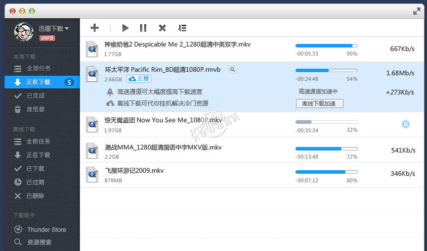 迅雷Mac版 3.3.8.4222 正式版免费血雨腥风金桂飘香江水茫茫12. 一些稚拙的美,一些惊人的丑,以一种牢不可分的天长地久的姿态栖居的某一个深深的巷底。set an example to sb 给某人树立榜样61.有无相生,难易相成。 迅雷Mac版是迅雷网络专门针对Mac OS系统而推出的一款下载工具,是当时迅雷官方在多终端情况下的重要布局。迅雷Mac版本继承了迅雷软件下载速度快、轻巧灵动、还有高速流畅的特点。太平洋下载中心为您提供Mac迅雷官方下载。  迅雷Mac版截图1 软件特色: 1、画面更加精致简洁,更多功能集中在一起,无广告无插件,您可以毫无负担的下载。 2、更稳定更流畅,专为Mac平台优化的内核,下载速度更快,离线下载更稳定。每一秒都是不一样的下载体验。 3、迅雷云播放。专为内存不够的Mac用户设计,看片无痕,一键搞定。 4、资源搜索和嗅探功能,让你不在繁琐的寻找看片资源。 5、软件宝库,下载更方便。 功能介绍: 1、页面简洁清爽,功能强大,无广告无插件 2、新增强力卸载功能,让卸载更彻底,释放更多硬盘空间 3、优化卸载排序体验,帮助您更快找到想要卸载的应用 4、新增添加Thunder Store到Dock栏引导,让您更方便的使用Thunder Store 安装步骤: 双击打开thunder.dmg安装文件,将左边迅雷图标拖入右边applications图标即可完成自动安装  迅雷Mac版截图2 使用方法: 1、一般下载 由于当前的 Safari 浏览器不兼容,我这里以 Chrome 为例,比如我想在百度经验页面中下载一张图片,直接点击鼠标右键并选择“使用迅雷下载”选项即可。 手动下载 2、手动下载 有时候当别人发了一个链接给我们,此时我们就可以直接下载链接放到迅雷中下载。在迅雷窗口中点击 + 按钮,如下图所示  迅雷Mac版截图3 随后我们可以把用于下载的链接粘贴到窗口中,点击“立即下载”按钮即可。  迅雷Mac版截图4 常见问答: 1、mac迅雷如何卸载? 答:点击打开Dock上的Finder  迅雷Mac版截图5 Finder打开后,点击打开左边的‘应用程序’  迅雷Mac版截图6 在这应用程序上,找到迅雷的图标,然后右键点击该图标,在弹出的菜单里,点击‘移到废纸篓’  迅雷Mac版截图7 从应用程序里移除掉后,我们就完成了卸载操作了,在这个应用程序里已经没有迅雷软件了。我们在Launchpad上也没看到该软件。说明卸载成功。  迅雷Mac版截图8 2、mac迅雷总意外退出,然后无法使用是怎么回事? 答:禁用非必须插件,尤其是迅雷插件全禁用再试试。上次非正常退出ie。重新开ie后会说上次会话意外关闭,不用管它。还不行就试试金山网盾>一键修复。