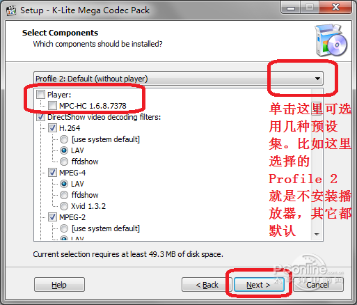 K-Lite Mega Codec Pack 选择安装位置 5、选择组件,如下图所示。MPC(Media Player Classic)是一个非常受欢迎的播放器,多平台支持。实际上看各自的习惯吧,根据你的需要决定是否要把图中红框所圈部分都取消选择 。默认是选中的。 其它的各个组件不用做修改,保持默认就行了,然后 Next > 进入下一步。