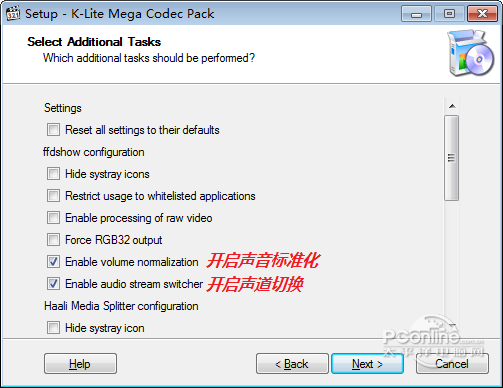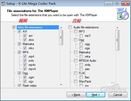 K-Lite Mega Codec Pack 选择关联播放器 10、文件关联。 分两种情况: 如果上一步中选择了某个播放器,则这里的文件关联会关联给该播放器; 如果上一步没选择任何播放器,则不显示这一步,而直接跳到下一步。 如果选择的是 KMPlayer,则为我们刚才选择的播放器(KMPlayer)选择文件关联,也就是选择那些要用 KMPlayer 播放的文件类型。左边是视频文件,建议直接勾选上面那个框框以实现全选;右边是音频文件,建议不要选择(因为就我个人而言,我只用mp3格式的音频,而且只用iTunes播放),当然你也可以根据自己的喜好来选择。然后 Next > 进入下一步。
