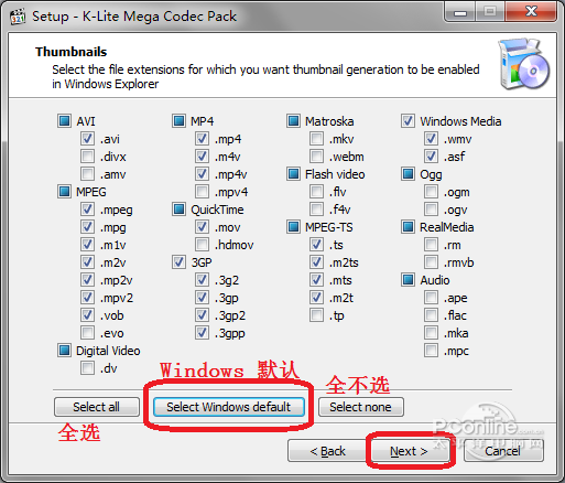 图5 为第4步选择的播放器选择要关联的文件 11、缩略图。就是当我们浏览文件的时候,Windows 资源管理器(文件夹)中显示的某文件的图标。 不用那么麻烦。建议直接通过图中靠下位置的三个按钮的中间那个,选择 Select Windows default(使用 Windows 默认)。第一个是“全选”,第三个是“全不选”。然后直接 Next > 进入下一步。