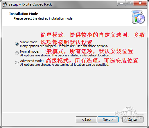 图2 K-Lite Mega Codec Pack 安装模式选择 共有三种模式可选: 简单模式:提供较少的自定义选项(可选择使用的播放器、设备的扬声器类型)30. 人生百味,酸甜苦辣都要尝遍。失恋只是其中一味,再苦有黄连苦么?你一辈子吃几次黄莲?人到了一定年龄风花雪月就自动免疫,趁着还有感觉为什么不体验一下悲悲戚戚?,多数选项都按照默认设置 一般模式:所有选项(可选择是否安装 Media Player Classic 播放器) ,默认安装位置 高级模式:所有选项,可选安装位置 根据需要选择一种即可。下面以“高级模式”为例,因为它的步骤中包含了前面 2 种模式里的所有步骤。所以,如果你选择了前面的某个模式来安装,下面的步骤可以跳着看。 提示:在最后确认安装之前,你还可以返回到这里重新选择安装模式。 4. 选择安装位置。默认是安装在 Windows 系统默认的程序文件夹中。看你的习惯,改不改都一样。如果要改,单击下图中中间靠右的那个按钮,浏览选择安装位置即可。然后单击下面的 Next >。