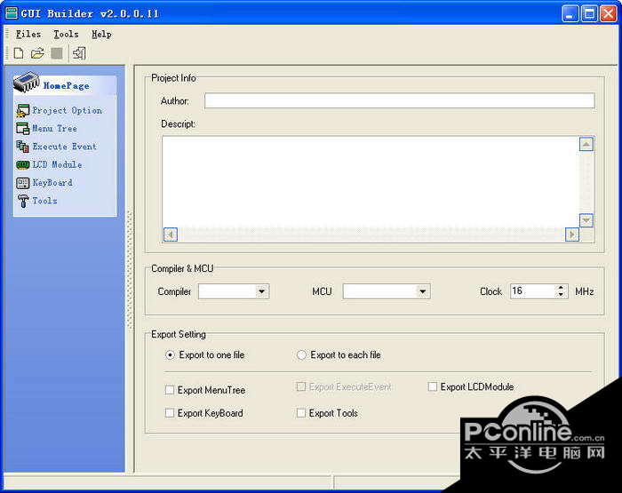 那么,试试这个软件,GUI Builder v2.0.11,能自动生成四种常用的C编译器(CVAVR,ICCAVR,GCC,IAR)的C源代码,100%的C源代码。 GUI Builder v2.0 有以下特色 1.自动生成LCD的 驱动程序,有多种LCD模型可选,模型可以自定义。