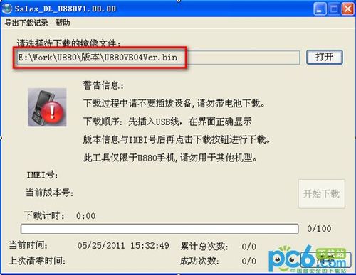 (3) 打开软件,并插入手机后,请不要在IMEI号显示出来前拔除设备,否则可能导致软件卡死。IMEI号显示后,在不点击升级按钮的情况下,直接拔出USB线,则对设备和软件没有任何影响。
