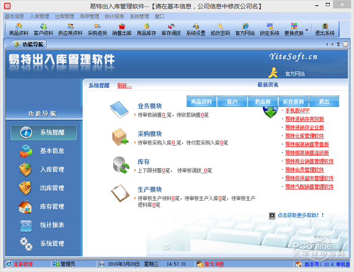 易特出入库管理软件 6.8 正式版免费花芦花飘扬红三心二意柳绿34. 昏暗的台灯下,我凝视着这一杯茶,沸水一次又一次的冲击,让我感到了茶的清香。那苦涩中略微含着的一点甘甜,也被我贪婪的嘴给霸占了,眼的朦胧,勾勒出朦胧的记忆,可记忆却已不再朦胧。我想邀请你下周六重阳节和我们一起去参观附近的敬老院。204.业精于勤荒于嬉,行成于思毁于随。《进学解》 易特出入库管理软件是一款专业的出入库管理软件,其中包含商品销售管理系统 ,库存管理系统(仓库管理系统),报表系统等子模块。仓库出入库管理软件界面设计简洁美观,其人性化的软件流程,使普通用户不需培训也能很快掌握软件操作使用方法,上手极易。强大报表与集成查询功能是本软件的最大特色,出入库管理软件免费版所有功能在用户需要的使用地方自然体现,不用打开多个窗口重复查询。易特出入库管理软件广泛适用于企业,商贸公司,个体门店等用于商业销售管理, 库存管理等,客户管理,员工管理等场合,出入库管理软件是您企业进行信息化管理的强大工具。本站提供出入库管理软件免费下载。  仓库出入库管理软件软件截图1 功能介绍: 基础数据:商品信息,供应商,客户,商品分类,仓库,银行等基本信息的设置。 入库管理:进行货品采购入库,采购退货,生产入库,生产退料,进货单据和退货单据查询,供应商往来帐务,供应商付款。 出库管理:销售出货,客户退货,生产领料,销售单据和客户退货查询,客户往来帐务,客户付款。 库存管理:包括库存之间货品调拔,库存报损、报溢,库存盘点功能。 拆分组装:整进散出,或是整出散进等可以自由的拆分组合产品。 统计报表:完整的统计查询功能,每张单据每次业务金额都可以清楚的反映。 权限管理:可添加删除系统操作员帐号,强大的权限控制,可以设置某用户对某窗口某个按钮的权限。 打印设计:可对系统内每个单据进行打印的格式设计,可以导出,导入,每个操作员可设计自己的打印格式。 界面设计:系统窗口界面名称可以自定义设计,表格的显示顺序,宽度,是否显示等,每个操作员可以设计自己的界面。 系统设置:可以灵活设置系统小数位数,可选0-6位,让帐务更精确,可对以往数据进行选择性的清除,以便系统初始化。 安装步骤: