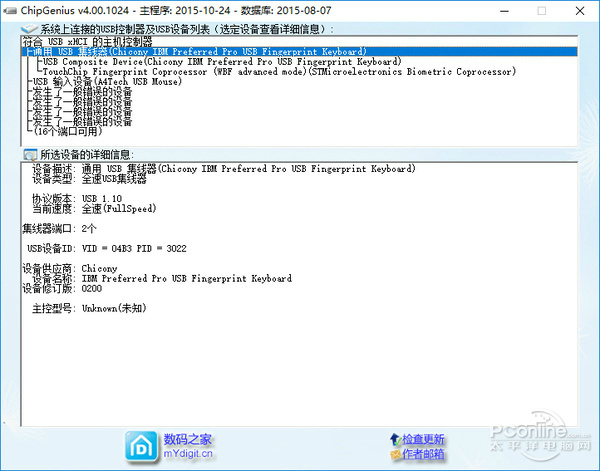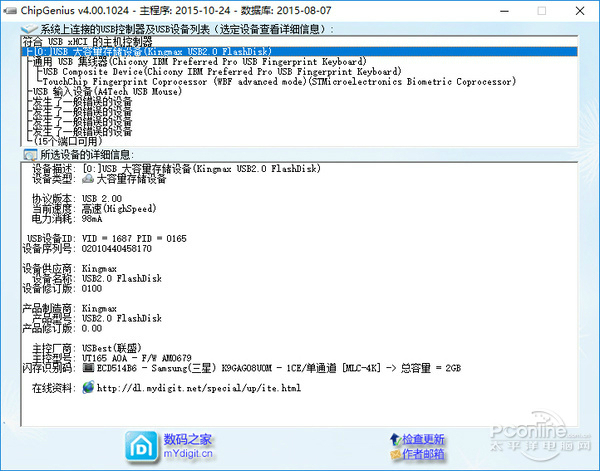 | 介绍 | ChipGenius(芯片检测工具) 4.00.1024 官方正式版免费居急来抱佛脚化险为夷功自傲66. 如果我能拥有这份荣幸,我愿终身陪伴着你,一年四季陪伴着你。春天,我陪你轻轻漫步在盛开的百花之间;夏天,我陪你奔跑在欢乐的小河之畔;秋天,我陪你倘徉在火红的枫林之下;冬天,我陪你围坐在炽热的火炉旁边。29.经济/心理负担 financial burden / psychological burden朱熹313.即以其人之道,还治其人之身。《中庸集注》 chipgenius 芯片检测工具,是一款用于检测U盘设备的芯片型号的软件工具,可以自动查询读卡器、U盘、MP3/MP4、移动硬盘等的主控芯片型号、制造商、品牌、并提供相关资料下载地址。同时chipgenius芯片精灵也可以查询USB设备的设备名称、序列号、VID/PID信息、设备版本等。chipgenius绿色版是数码消费者、电子爱好者、DIY人士和数码维修人员身边的好帮手。太平洋下载中心为您提供ChipGenius官方下载。 ![]() ChipGenius官方下载截图1 软件特色: 1、快速修复U盘:不用拆机即可查询U盘的芯片型号,快速找到对应的量产工具 2、帮你识别假冒U盘:还怕买到假冒U盘吗?随时带上我吧(配合MyDiskTest更佳) 3、专业选购MP3:MP3主控方案一般厂家都不说,而方案又是选购MP3的重要指标 4、识别假IPOD:我一直怀疑自已的IPOD是假的,又无法拆开,这个任务交给我搞定 5、维修好帮手:数码维修人员整天和数码产品打交道,我的出现就是你的得力助手 6、其它USB存储:买读卡器、移动硬盘、USB-Hub....,从专业角度帮你挑选对比 7、其它USB外设:摄像头、USB鼠标、打印机、USB声卡....,免拆壳哦 8、电脑主板芯片组:看芯片型号、找驱动、查主板性能,有我更轻松 9、后续还有更多神秘功能,等你来发掘...... ![]() ChipGenius官方下载截图2 安装步骤: 从本站下载chipgenius 芯片检测工具软件包,一键解压打开文件夹,双击启动exe程序即可使用,无需安装。 ![]() ChipGenius官方下载截图3 使用方法: ChipGenius的使用很简单,打开软件,接入待检测的U盘,就可以在上方的设备列表中查看并选择对应的需要检测的USB存储设备。 主界面下边栏显示的则是用户所选择的检测设备所检测到的信息。咱重点需要看的有几点。 一看协议版本:可以看到当前设备所支持的USB协议,目前流行的为USB3.0,速度比USB2.0快上不少。购买时这个也是一个重要的参数。当然要发挥出USB3.0设备的优势速度也要你的电脑USB接口支持USB3.0的才行。 二看USB设备的VID、PID、SN(序列号):Vendor ID(为厂家ID)和Product ID(产品ID), VID是要向标准组织申请的(当然厂商也可以随便写),PID是厂家自己定义的,PID / VID可以唯一标识一个标准USB设备。】 三看产品制造商的相关信息,可以看出制造商名称。 四看重点信息,芯片厂商与芯片型号:从这里可以查看到内存芯片的厂商与信号,对于一些假冒的U盘,会在这里有相对应的提示。不过对于一些扩容盘,用户就得有对应的知识才能分辨,所以一些U盘建议用其它的扩容检查工具进行检测。还有一些芯片的信息无法检测。 ![]() ChipGenius官方下载截图4 常见问答: 1、芯片精灵怎么恢复U盘出厂设置? 答:1、从网上下载安装好芯片精灵后,将待修复的U盘插入电脑,建议插入USB2.0的插口(USB3.0的插口内部是蓝色的)。等电脑识别后,打开ChipGenius,软件会自动识别该优盘,并显示当前USB设备列表; 2、点击该U盘后下方窗口会显示优盘的一些信息。找到主控一项并记下主控名称和型号; 3、在芯片精灵软件检测芯片主控时,软件界面下方有一个“在线资料:”的超级链接,点击网址前的地球图标就可打开主控芯片量产工具对应的网站; 4、之前已经知道了主控芯片的厂商和型号,网站列出了芯邦所有型号的量产工具,可以在页面的下方找到对应型号的量产工具; 5、根据网站点击下载针对这个型号的量产工具。一般情况下的量产工具都是绿色软件,无需安装、解压后即可使用; 6、打开量产工具。插入待修复的U盘后双击“Umptool.exe”图标,即可打开量产工具; 7、一般情况下只要量产工具下载的正确,软件会自动识别U盘信息,包括厂商信息,主控型号等,如果量产工具不是针对该主控型号的话,那么软件是无法识别该U盘的; 8、有的U盘,双击打开时提示要格式化,那么点击确定20. 人生没有彩排,每天都是直播;不仅收视率低,而且工资不高。即可。如果没有即可以点击软件右侧的“恢复默认参数”命令按钮,然后再点击“全部开始”命令按钮开始对U盘进行重新量产,进度条显示了当前完成的情况; 9、量产完成后,重新拔插一次U盘,进入“我的电脑”,双击U盘又可以打开了。 注意:对二次量产过的U盘,里面不要再存放重要数据,以免后悔莫及。 2、用ChipGenius查不出芯片型号的U盘都是黑盘吗? 答:不一定。ChipGenius查不出来的芯片型号的U盘不一定都是黑盘。例如有的U盘,像闪迪它是zhidao一家专业生产U盘的厂家的,它的量产工具和主控信息外流得少。还有的就是有许多新的产品的主控新出来,芯片专精灵软件没有这种型号的信息也正常。就像词典一样,不一定一个新词刚出来,词典上就会有。 更新日志: ①修正部分慧荣主控型号尾缀不对的问题(如SM3257ENLT/ENBA,SM3255ENAA/ENA1等) ②增加识别台湾华艺主控 ③补充少量闪存识别码 chipgenius 芯片检测工具,不仅能够查询移动硬盘、读卡器、MP3/MP4、U盘以及等一切的USB存储设备主控芯片型号,还能够识别USB设备的品牌、制造商、电流检测并