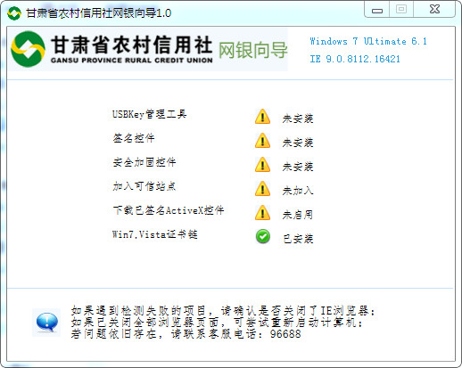 甘肃省农村信用社网银向导 1.0 官方版免费壮志凌五湖四海云朝夕相处67. 如果你发奋去发现完美,完美会发现你;如果你发奋去尊重他人,你也会获得别人尊重;如果你发奋去帮忙他人,你也会得到他人的帮忙我们也会一起愉快的唱歌、跳舞和玩游戏,我们希望这能使他们快乐。范仲淹272.先天下之忧而忧,后天下之乐而乐。《岳阳楼记》 甘肃省农村信用社网银向导是在电脑上登陆甘肃省农村信用社网上银行的辅助工具,它能帮助您配置甘肃省农村信用社网上银行的使用环境,以便您能顺利的登陆和使用甘肃省农村信用社网上银行。  使用方法 1、下载安装甘肃省农村信用社网银向导 下载后解压缩,运行 NXYWizard_setup.exe,将自动为您完成驱动、安全控件的安装及设置 2、运行甘肃省农村信用社网银向导 运行网银向导,安装驱动和控件。安装过程中请关闭杀毒软件和防火墙并忽略可能产生的安全告警