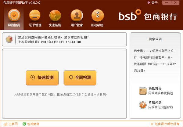 包商银行网银助手 2.0.0.0 官方版免费春鸦雀无声日上三竿色满园39. 希望源于失望,奋起始于忧患,正如一位诗人所说:有饥饿感受的人一定消化好,有紧迫感受的人一定效率高,有危机感受的人一定进步快。好习惯是成功的捷径。诸葛亮114.静以修身,俭以养德。《诫子书》 包商银行网银助手是包商银行官方推出的专供在电脑上登录和使用包商银行网上银行的辅助工具,可帮您检测网上银行的运行环境,并提供相应的设置功能,还有常见问题的使用帮助。  功能介绍 1.网银检测 对客户环境进行检测及一键修复,确保客户正常使用 2.证书管理 可快速前往我行证书下载页面 3.快速链接 可直接前往我行主页、个人网银、企业网银,了解我行热门产品 4.用户管家 提供网银助手个性化设置和网银相关软件的安装与卸载 5.互动帮助 提供企业、个人网银使用所遇问题解答 使用方法 1.打开网银助手后,先根据自身的情况,选择USBKEY的型号是专业版,还是大众版,或者直接把USBKEY插到电脑上 2.然后,网银助手会自动检测各种与包商银行网银相关的插件和环境,并给出详细的检测报告,如果有问题,可以点击“一键修复”按钮,进行修复 11. 把每一天过好是最大的幸福,快乐源于每天的感觉良好。总忧虑明天的风险,总抹不去昨天的阴影,今天的生活怎能如意?总攀比那些不可攀比的,总幻想那些不能实现的,今天的心灵怎能安静?任何不切实际的东西,都是痛苦之源,生命的最大杀手是忧愁和焦虑。