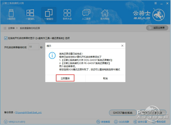| 介绍 | 云骑士装机大师 12.7.48.1945 官方版免费千丝闻鸡起舞万喋喋不休缕47. 书是全世界的营养品。我们现在就是一棵等着吸收营养的小苗,只有读书,丰富课外知识,才能吸收营养,长成参天大树。当然,读书可以使人增长知识,但开卷只是在有益的条件下,而不是随便什么书都可以。汉代刘向曾说过:‘书犹药也,善读之可医愚。’书既然是药,就备有两种功能:一是良药,药到病除;一是毒药,可以置人于死地。这不是开卷未必有益吗?看电影被视为一种很好的娱乐方式。高适153.千里黄云白日曛,北风吹雁雪纷纷。莫愁前路无知己,天下谁人不识君。《别董大》 云骑士装机大师是一款重装系统辅助工具软件,它的操作简单,兼容性强,不用懂专业电脑技术,自己也可完成安装,是你维护电脑最好的辅助工具。本站提供云骑士装机大师官方下载。 ![]() 云骑士装机大师软件截图1 更新日志: 更新日志 1.修改了 WindowXp环境下在线装机系统下载界面中的已下载字样显示不全 2.修复了在线装机安装部署时界面白屏的问题 3.优化重装步骤; 功能介绍: 1、无需光驱,无需U盘,智能一键重装正版系统 2、UEFI与MBR完美结合,一键制作,简单易用 3、快速备份,稳定可靠、完美兼容 ![]() 云骑士装机大师软件截图2 软件特色: 1、多个系统版本供选择安装,提高选择性和灵活性 2、安装系统快捷,稳定,节省时间 3、无需任何费用,省心省事 ![]() 软件截图3 安装步骤: 1、下载云骑士装机大师安装包点击打开 ![]() 软件截图4 2、即可运行云骑士装机大师 使用方法: 云骑士装机大师如何在线重装系统教程? 1、点击下载云骑士装机大师软件,并正常打开, 点击软件首界面"系统重装"按钮,进行环境检测 ![]() 软件截图5 2、进入"系统选择",云骑士装机大师将提供XP,Win7, Win8,Win10系统进行选择。用户根据需求选择系统 ![]() 软件截图6 3、进入"备份资料",选择完需要备份的资料后点击"下一步" ![]() 软件截图7 4、进入“下载文件”,云骑士装机大师在为用户提供全新系统下载的同时对文件进行备份,等待完成即可 ![]() 软件截图8 5、系统下载完成,电脑将自动重启。云骑士装机大师重装将不需人工操作全自动安装完成 ![]() 软件截图9 云骑士装机大师系统一键备份教程? 1、打开云骑士装机大师,点击【备份/还原】,然后点击【系统备份和还原】 ![]() 软件截图10 2、选择【Ghost备份和还原】,点击【Ghost备份寸长尺技拼音:cùn cháng chǐ jì释义:犹言微才薄技。出处:《二刻拍案惊奇》卷三九孟尝君平时养了许多客,今脱秦难,却得此小人之力,可见天下寸长尺技,俱有用处。”示例:无系统】,选择Ghost压缩率 ![]() 软件截图11 3、下载Windows PE镜像 ![]() 软件截图12 4、提示系统备份设置已经完成,点击【立即重启】进行系统备份 ![]() 软件截图13 5、选择PE-Ghost或DOS-Ghost系统备份模式 ![]() 软件截图14 6、进行系统备份,等待备份操作完成即可 ![]() 软件截图15 常见问答: 云骑士装机大师如何进行系统还原? 1、系统出现故障时,就可以使用系统还原将电脑还原到尚未故障的时候。打开云骑士装机大师,点击【系统Ghost备份和还原】,然后再点击【Ghost还原系统】,再弹出的提示框中点击【确定】还原系统 ![]() 软件截图16 2、提示系统还原设置已经完成,点击【立即重启】进行系统还原 ![]() 软件截图17 3、选择PE-Ghost或DOS-Ghost系统还原模式 ![]() 软件截图18 4、进行系统还原,等待还原操作完成即可 云骑士装机大师diskgenius硬盘如何分区? 1、首先准备好一个已经制作好了U盘启动的U盘,如果还没有制作,那么需要准备一个8GB以上的U盘,将U盘一键制作成USB启动U盘即可。 2、将已经制作好的云骑士U盘启动盘插入到电脑的USB插口,然后重启电脑,之后进入Bios设置,将U盘设置为第一启动项目,完成后,保存并推出,之后电脑会自动重启启动。 3、电脑重新启动后,就会进入如下界面,这里我们选择进入PE工具即可 ![]() 软件截图19 4、进入PE桌面之后,我们在桌面就可以找到“分区大师”了,点击运行即可 ![]() 软件截图20 5、在打开的DiskGenius软件界面上部,点击“快速分区” ![]() 软件截图21 6、接下来在左侧可以选择分区数目,这个主要根据自己硬盘容量来分区,如果硬盘容量超过500G,我们可以四个以上分区,。另外由于选择几个分区,每个分区容量都是平均分的,如果需要调整各分区容量大小,可以在右侧的“高级设置”下,自行调节,完后后,点击底部的“确定” ![]() 软件截图22 7、接下来我们等待DiskGenius给硬盘分区完成即可,此过程需要格式化所有硬盘,因此如果此前硬盘上有重要数据,请切记之前已经备份到U盘或者其他科移动磁盘中 ![]() 软件截图23 Win7备份程序无法启动怎么解决? 1、按下Win+R键打开运行,在窗口中输入services.msc并按回车 ![]() 软件截图24 2、在打开的服务窗口中,在右侧找到并双击打开“Windows Backup”,将启动类型改为“自动”,并启动该服务 ![]() 软件截图25 3、重启电脑,打开备份和还原,即可进行备份 ![]() 软件截图26 小编认为:作为一款系统重装软件,云骑士装机大师提供了一键备份、一键还原以及系统重装的功能,并且快速备份、稳定可靠、完美兼容,云骑士装机大师让用户们体验到系统重装的便捷,UEFI与MBR完美结合一键制作,简单易用,让用户操作起来更容易上手。 厌莺声到枕,花气动帘,醉魂愁相半。被惜余熏,带惊剩眼,几许伤春春晚。泪竹痕鲜
