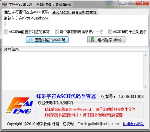 字符ASCII代码互查器 1.0 正式版免费月若隐若现面黄肌瘦色迷人13. 时间好比一条小溪,它能招引我们奔向生活的海洋;时间如同一叶扁舟,它将帮助我们驶向理想的彼岸;时间犹如一支画笔,它会指点我们描绘人生的画卷。77. I think all of us should mind our behavior in public places.(2012.福建) 我认为我们大家都应该注意在公共场所的行为举止。116.非学无以广才,非志无以成学。《诫子书》 字符ASCII代码互查器是一款可以帮助你轻松快速的查看字符的ASCII代码的字符编码转换器,也可以反着查询,输入字符,可以获取对应的ASCII代码(十进制或十六进制)。  功能介绍 1、输入字符,可以获取对应的ASCII代码(十进制或十六进制); 2、输入十进制或十六进制的ASCII代码,可以获取对应的字符。 使用方法 1、输入需要查询的字符,点击查询,可以得到字符的ASCII代码;  软件截图2 2、如果你勾上一些相应功能,可以更好的浏览;  软件截图3 3、也可以反着来查询相应的字符!  软件截图4