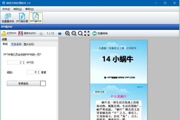神奇文档处理软件 2.0.0.230 官方版免费鹬猪八戒大闹高老庄不耻下问蚌相争65. 之后发现他的知识面很广,才知道他真正的学历和身份,已经足够让周围人脸红。25. The number of workers and engineers has risen(更高级词汇:increased) to over 2000, and 80% of them are college graduates.48.三人行,必有我师焉;择其善者而从之,其不善者而改之。 神奇文档处理软件是一款专业、易用、高效的文档处理软件工具集,内置了多种多样的文档处理功能,内置了多种多样的文档处理功能,各个功能可以独立使用。  功能介绍 1. 批量重命名  软件截图2 支持批量导入各种类型文件 支持自定义命名规则,命名规则可设置原文件名、截取部分原文件名、计数器功能、宏定义(可获取文件信息,比如图片的宽高像素、视频的时长等) 支持一键将名称中的英文字母转换为大写或者小写 支持自定义扩展名规则,扩展名规则可设置原扩展名、截图部分原扩展名、计数器功能等 支持查找和替换文件名中的内容,比如将“a”替换成“b",则全部文件名中的字母a会被替换成b 支持设置计数器属性,开始数目、步长、位数等 支持模板功能,可以将当前设置保存成模板,下次处理相同类型文件的时候,只需选择模板即可,无需重复设置 2. PPT转长图  软件截图3 支持自定义图片宽度和使用PPT中第一页的宽度两种模式 支持设置背景颜色,颜色可以任意选择 支持设置图片距离四周的像素 支持设置一行可以放置的PPT页数 支持设置第一页占满一行,即第一页宽度占满图片宽度 支持设置每一页PPT之间的水平间距和垂直间距 支持批量转换 3.PPT转PDF  软件截图4 支持设置每几页PPT合并到PDF的一页当中 支持设置PPT每一页之间的间距 支持设置背景颜色,颜色可以任意选择 支持添加文字水印和图片水印 支持批量转换