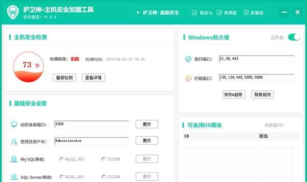 护卫神主机安全加固工具 1.1.1.1 免费版免费静静地想(静思默想)美不胜北风呼啸收23. 这个夏季,我依然在指尖书写着断章遐思!心语,在风中,在生命的驿站中缠绵着,在岁月中似水静静地流淌着,不知今夕,不知何夕!45.因特网 the Internet (一定要由冠词,字母I 大写)5. 如切如磋,如琢如磨。 护卫神主机安全加固工具是一款系统安全软件,可以帮助用户给系统安全加固,可以快速设置服务器安全,操作系统运行安全,是一款安全实用的软件,绿色免安装,有需要可以下载。  功能介绍 1、主机安全检测,检测当前服务器总体安全状况,给出检测得分和解决方案建议。 2、设置远程桌面端口 3、修改系统超级管理21. 我是个俗气至顶的人,见山是山,见海是海,见花便是花。唯独见了你,云海开始翻涌,江潮开始澎湃,昆虫的小触须挠着全世界的痒。你无需开口,我和天地万物便通通奔向你。员用户名 4、MySQL数据库一键降权或恢复 5、SQLServer数据库一键降权或恢复 6、Windows防火墙开启和关闭 7、一键设置常见安全端口的放行规则 8、一键设置常见危险端口的禁用规则 9、一键关闭不需要开启的IIS模块组件 凤箫吟 韩缜漠漠水田飞白鹭,阴阴夏木啭黄鹂。护卫神主机安全加固工具,护卫神主机安全加固工具下载,网络防火墙,病毒安全36.To live is to learn,to learnistobetterlive.活着为了学习,学习为了更好的活着。 |