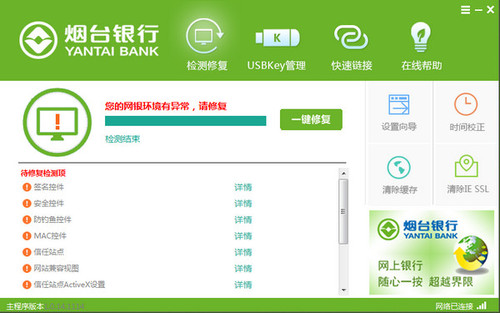 烟台银行网银助手是一款专门用于烟台银行网上银行的网银专用助手。该助手能够能够帮助用户一次性完成所有控件、驱动程序安装,集成化安装非常的简单易用。有了这款银行网银助手,各位亲们在网银付款的时候遇到的控件和驱动问题都可以帮助你解决。  使用方法 1、安装后打开网银助手,根据您的实际情况选择“无USBKEY”或“有USBKEY”,网银助手会根据您的选择,配置网银使用环境  软件截图2 2、如果检测到异常情况,点击【一键修复】网银助手会引导您修复问题  软件截图3 天阔云高,溪横水远,晚日寒生轻晕。闲阶静、杨花渐少,朱门掩、莺声犹嫩。悔匆匆、过却清明,旋占得、馀芳已成幽恨。却几日阴沉,连宵慵困,起来韶华都尽。319李白:清平调三首之三烟台银行网银助手,系统安全There were 100 traffic accidents in April, and increase of 5 percent in a five-month period. |
