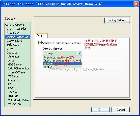 1.首先用IAR打开一个K60的工程,需要做一下设置,如下图:  2.设置如上图之后,编译链接整个工程,然后我们到$PROJ_DIR$\\FLASH_512KB_PFLASH\\Exe文件下找到.bin文件,如下图(.out文件为我们点击debug时用到的文件):  软件截图2 3.要烧写的文件准备好了,下面就需要打开J-Flash ARM软件了,上图:  水龙吟 陈亮西当太白有鸟道,可以横绝峨眉巅。Flash,ISP软件(J-Link,ARM),编程控件The danger (problem / fact / truth / point) is that… |