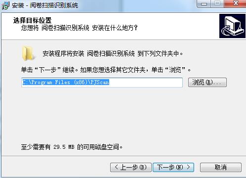 2、选择目标位置,也就是你想将阅卷扫描识别系统安装在哪个文件夹中,默认的是“C:\Program Files (x86)\PJScan”,可以点浏览修改