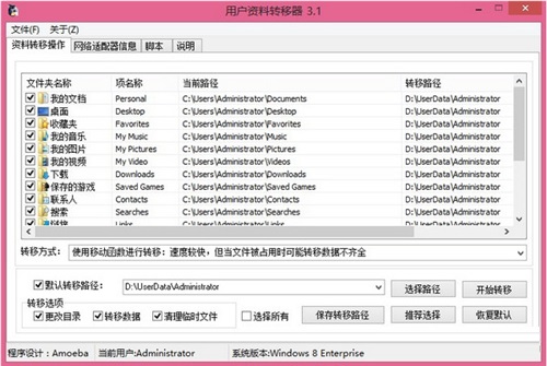 用户资料转移器官方版应用于转移WINDOWS当前用户的个人文件夹资料信息,预防当重装系统后个人资料丢失。采用最新技术,自行识别操作系统,自动识别当前用户,支持WIN2K以上操作系统,独创的脚本编辑功能,可让程序自动化执行操作,完成指定任务,自动跳过被占用文件。