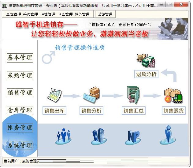 雄智手机销售管理系统综合众多手机通讯器材批发与零售企业的管理需求;以管理公司进、销、存为基础,以业务活动为主线,以资金流动为纽带,融入往来帐款管理,从而实现全面管理公司业务和帐务!