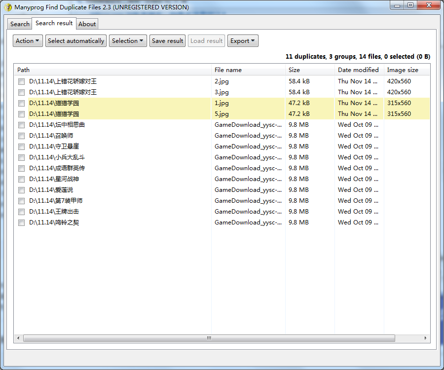 3、查找重复图像,包括搜索相似图像(bmp、gif、ico、jng、jpg、jpeg、jpe、jp2、jpc、j2k、png、tif、tiff、eps、clp、crw、cr2、dcx、exr、kdc、pcx、psd、raw、sfw、wmf);
